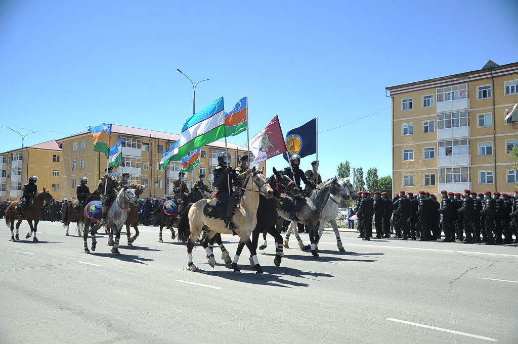 Шимоли-ғарбий ҳарбий округи, миллий гвардия, ҳуқуқни муҳофаза қилиш органларининг жанговар отлиқ ва пиёда аскарлари майдон бўйлаб саф тортиб ўтди. Уруш йилларининг ҳарбий техникалари, қурол-яроғлари, Қуролли Кучларимизнинг бугунги қудратини намоён этувчи замонавий техникалар сафини халқимиз алоҳида қизиқиш билан томоша қилди. Шундан кейин «Ватанпарварлик боғи»нинг тантанали очилиш маросими бўлди. Унда Қорақалпоғистон Республикаси Жўқорғи Кенгеси Раиси М.Камалов, Вазирлар Кенгаши Раиси Қ.Сариев рамзий тасмани кесиб, йиғилганларни боғнинг очилиши билан табриклади.