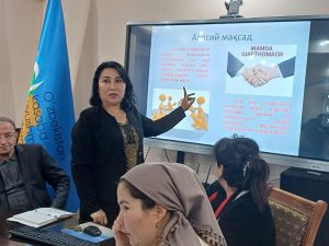Ўзбекистон агросаноат мажмуи ходимлари касаба уюшмаси Республика кенгашининг меҳнаткашларнинг ижтимоий-иқтисодий манфаатларини ҳимоя қилиш бўлими раҳбари Шоҳида Бегимқулова томонидан ўтказилган семинар-тренингнинг биринчи кунида туман, шаҳар кенгашлари раислари ва бош ҳисобчилари иштирок этди.
