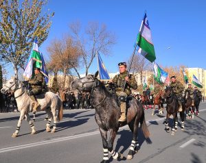 Байрам марказий кўча бўйлаб байроқларимизни баланд кўтарган миллий гвардия отлиқ аскарлари, автомото ва велоспортчиларнинг саф тортиб юриши билан бошланди.